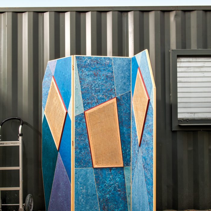 Screen #2 is a classic Martino Gamper work featuring no parallel lines and often overlooked materials like linoleum and blockboard. The Italian designer worked with one of London’s greatest caners to create the woven elements that are installed on both sides of the screen, producing a moire effect. antonkerngallery.com