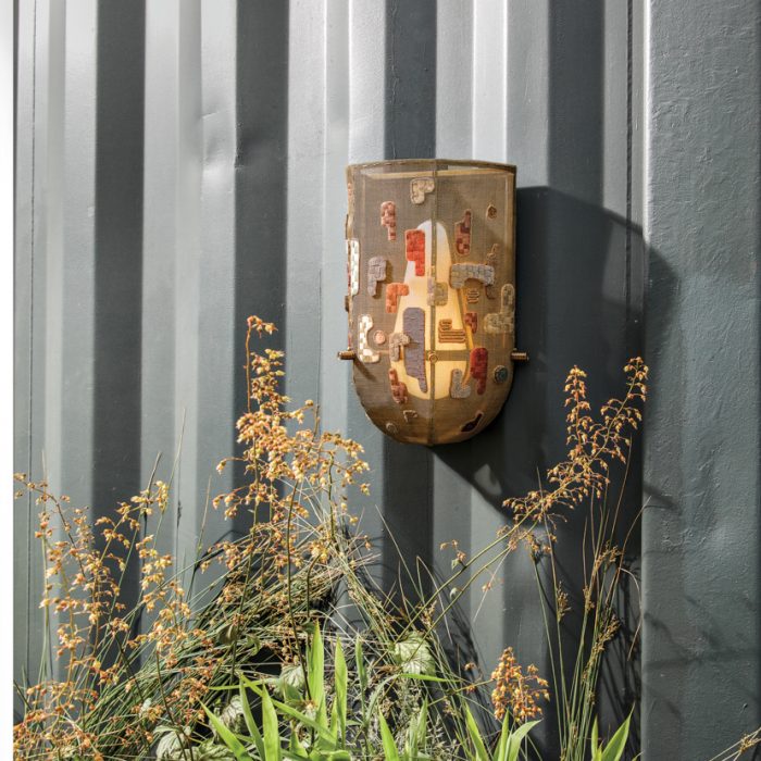 The ethereal Interlude Sconce from master light makers Apparatus presents a hand- embroidered brass mesh cage suspended around an illuminated alabaster core. Decorating the piece are intricate dimensional beading and threadwork that form an organic design and a tangible interpretation of a musical score. apparatusstudio.com