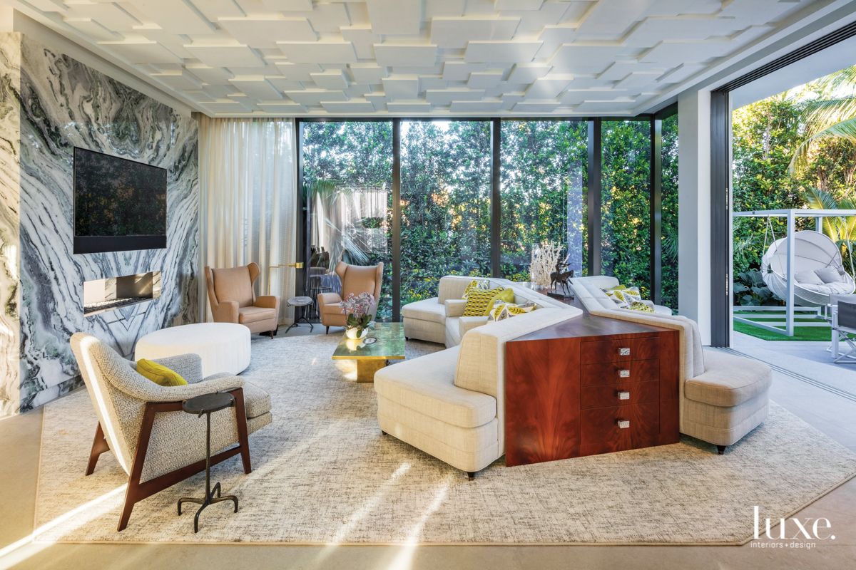 Book-matched Opustone quartzite dazzles in the living area of a Miami Beach home by designers Rob Brown and Todd Davis. The sofas and gray armchair are covered in a Holly Hunt Great Plains fabric. A vintage Maison Armand Jonckers coffee table rests on the Stark rug. Giannetti’s Studio in Brentwood, Maryland, executed the puzzle-block plaster ceiling.