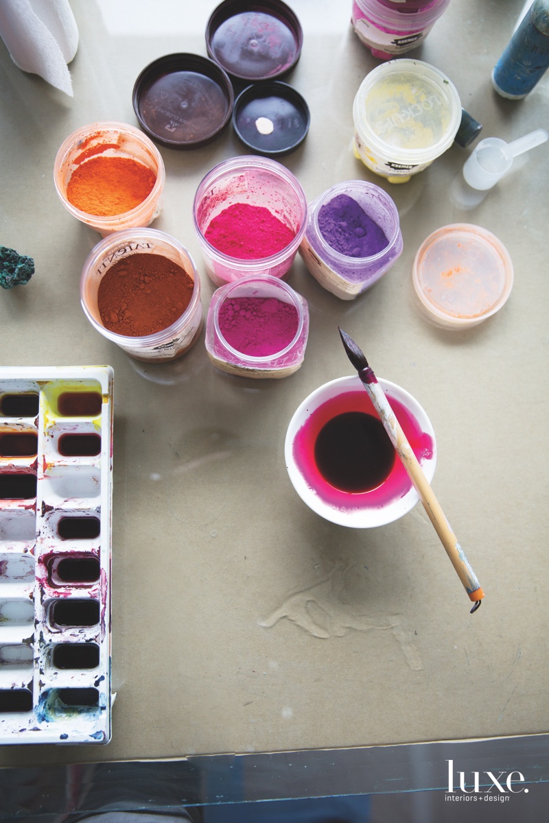 Lepretre describes shelving in her studio–which contains powdered pigments, mediums, tools, tape, acrylics and more–as her “personal candy store.