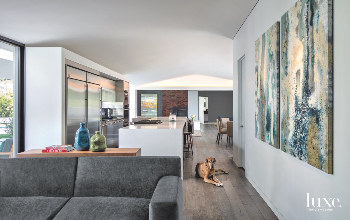 Next to the kitchen, which is the heart of the great room, Elliott arranged a Lee Industries sofa as part of a cozy seating area. Behind it, Noir’s QS Nelson console displays Jamie Young’s Dimple jug and vase from Bungalow. At the far end, a wall leading to the master suite is dressed in Gray Wonder by Dunn-Edwards Paints.