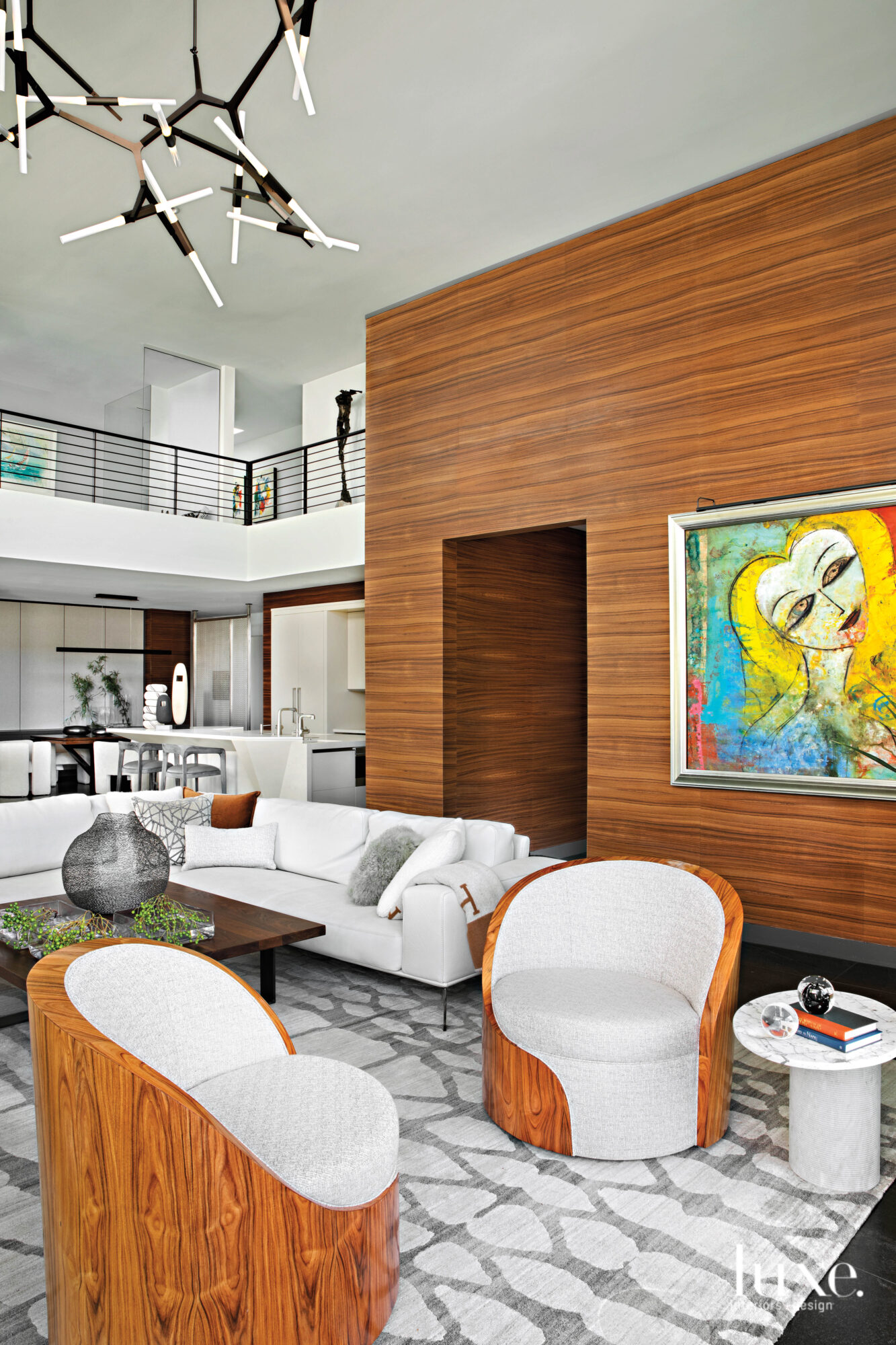 Designer Anita Lang incorporated a paldao wood veneer wall to serve as a striking backdrop for a colorful abstract portrait by Jamali. Modern sculptural lighting by Lindsey Adelman leads the eye to the second-floor gallery