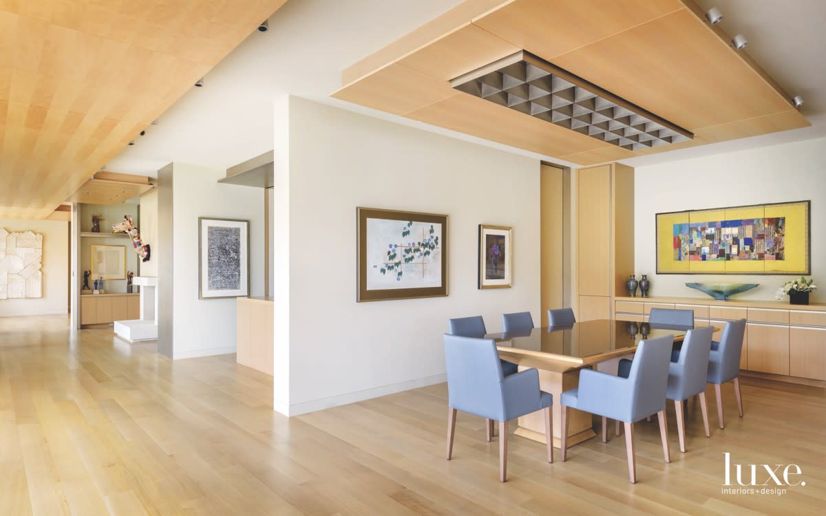 With such stunning pieces, it was necessary for the home to feel warm and inviting, while letting the art take center stage. “The architecture is light and neutral to provide a quiet backdrop for the art,” says Olson. Light woods, lustrous materials and cool colors–soft gray and blue furnishings throughout, with a touch of pink in the master bedroom–exemplify what’s on view.