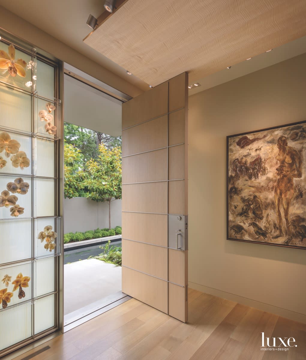 Several works were incorporated into the construction of the home, including the front-door glass installation (a collaboration between husband-and-wife artists Benjamin and Debora Moore).