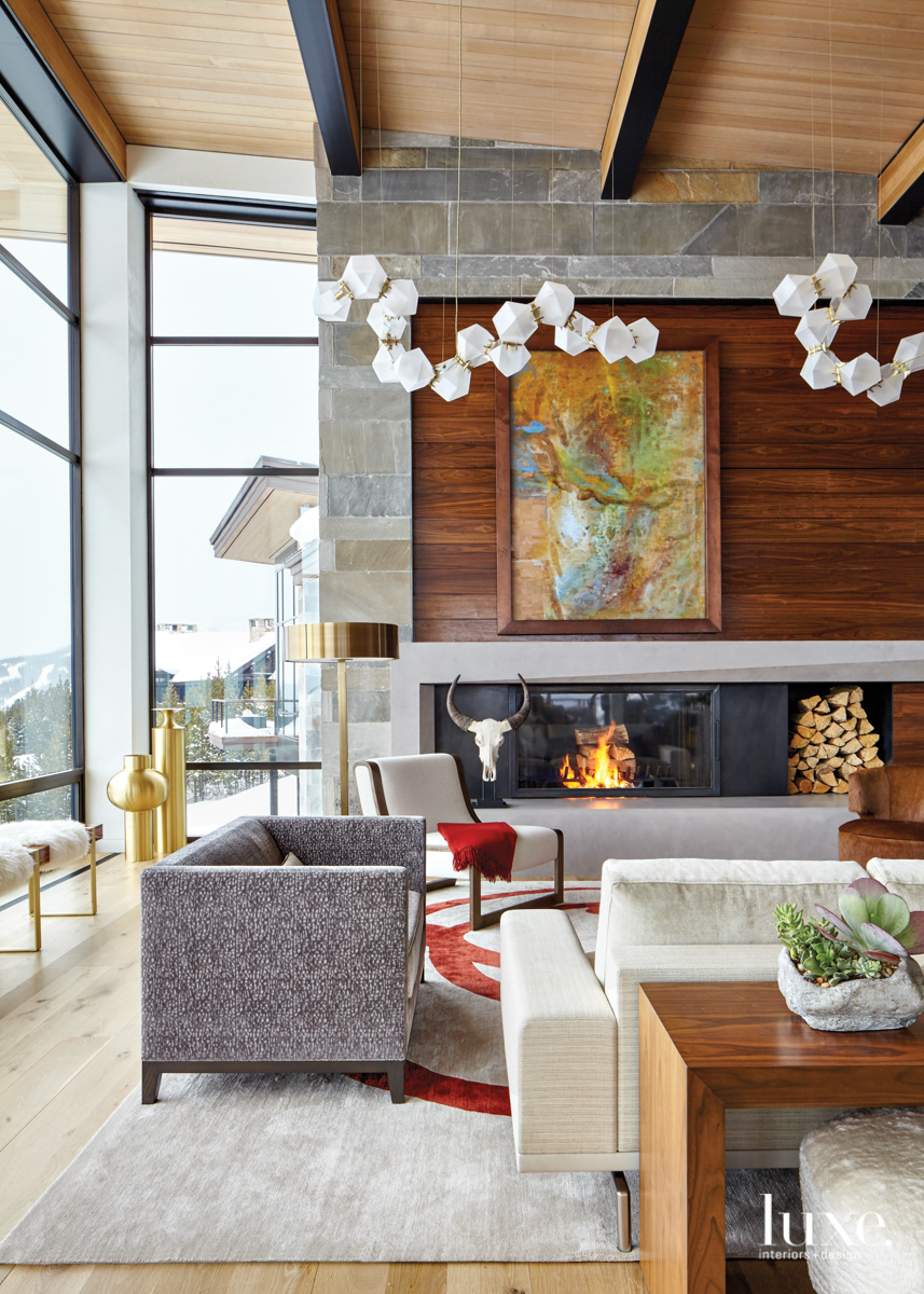A Big Sky residence by designer Heather Wells and architects Reid Smith and Bob Brooks offers a new take on alpine design. Lighting by Gabriel Scott hangs in the living room, which is appointed with a Holly Hunt sofa facing the fireplace.