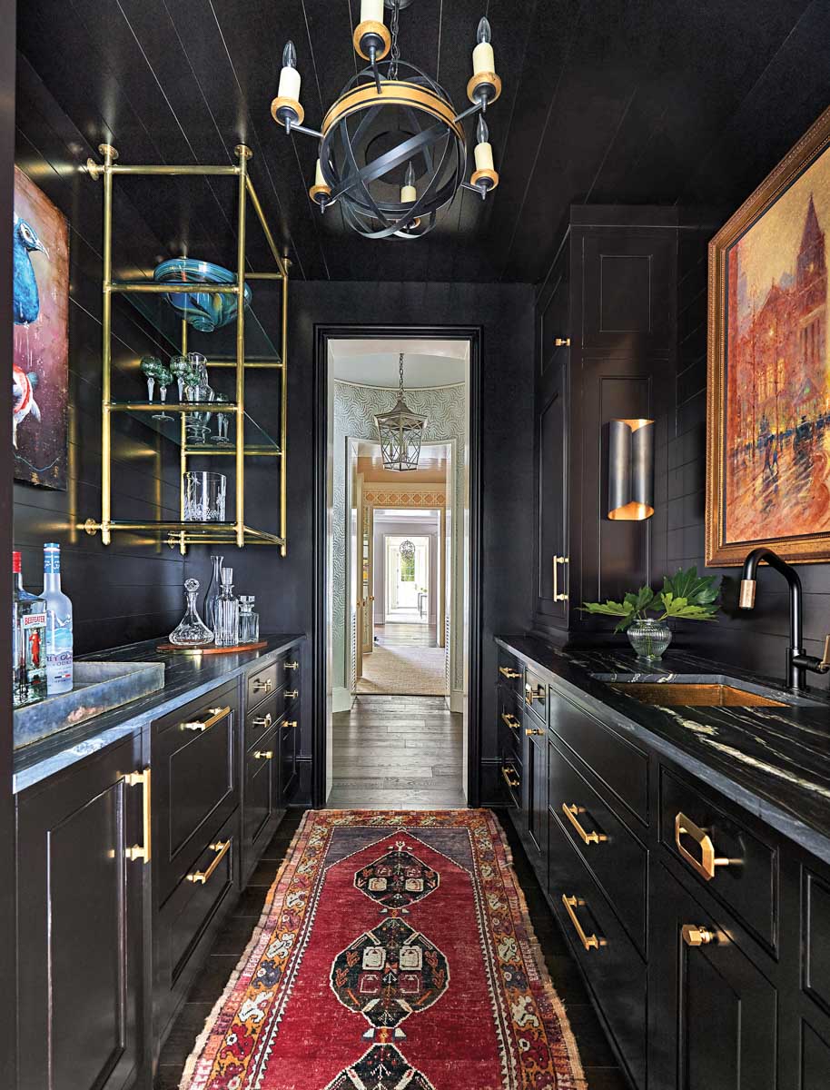 Working with architect Garrett P. Nelson, Fennebresque chose a Brizo faucet, Niermann Weeks chandelier and RH pendants for this bar room. A custom paint color from Eastway Paints and art by Sarah Helser from Hidell Brooks Gallery completes the look.