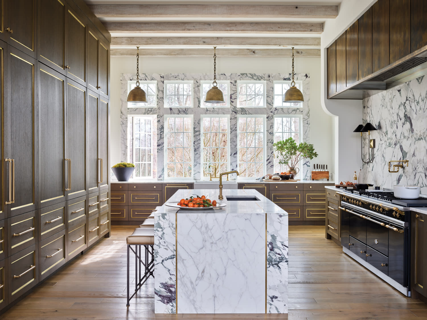 Amy Morris revamped this woodland retreat with an approachable Old-World feel for a Georgia family. Kingdom Woodworks custom cabinetry and bold slabs of Calacatta Viola Extra marble from Marmi dominate the kitchen, where a custom hood by Forge Fire Designs crowns the Lacanche range. The vintage brass pendants were found at Interiors Market.