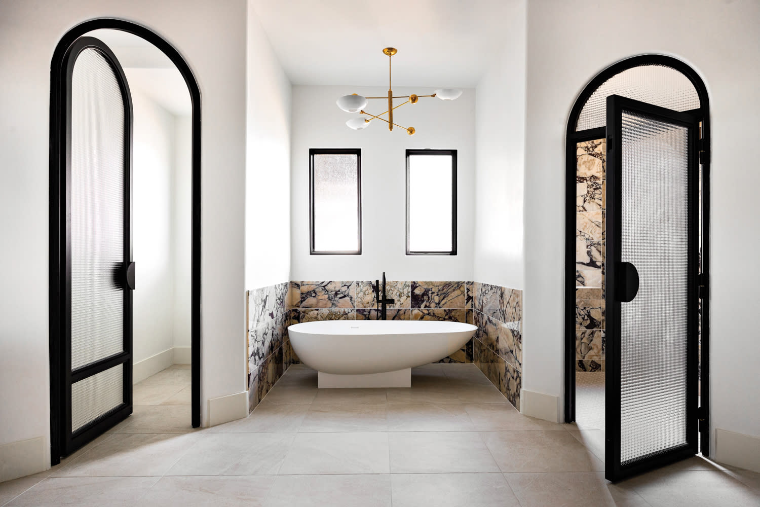 Seeing double? Kaitlyn Wolfe transformed this Paradise Valley, Arizona escape with thoughtful finishes. In the bathroom, Calacatta Viola marble tile from Bedrosians Tile & Stone encircles the freestanding Signature Hardware tub and completely fills the shower interior. The room is framed by cross-reeded doors.