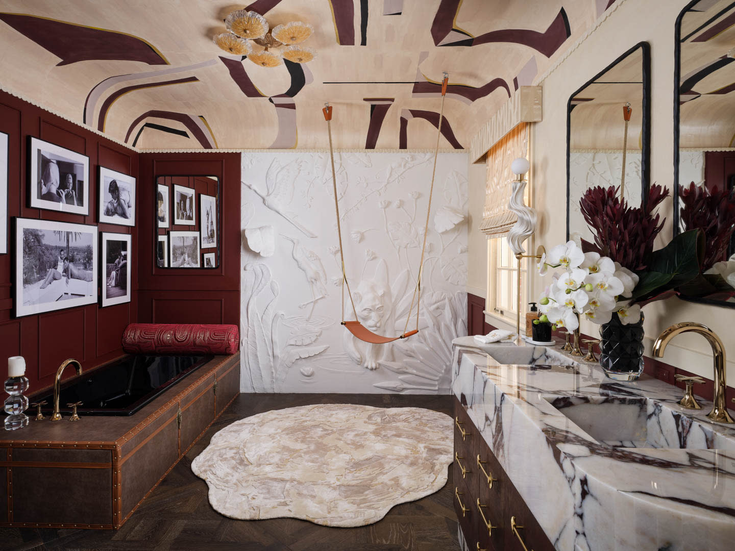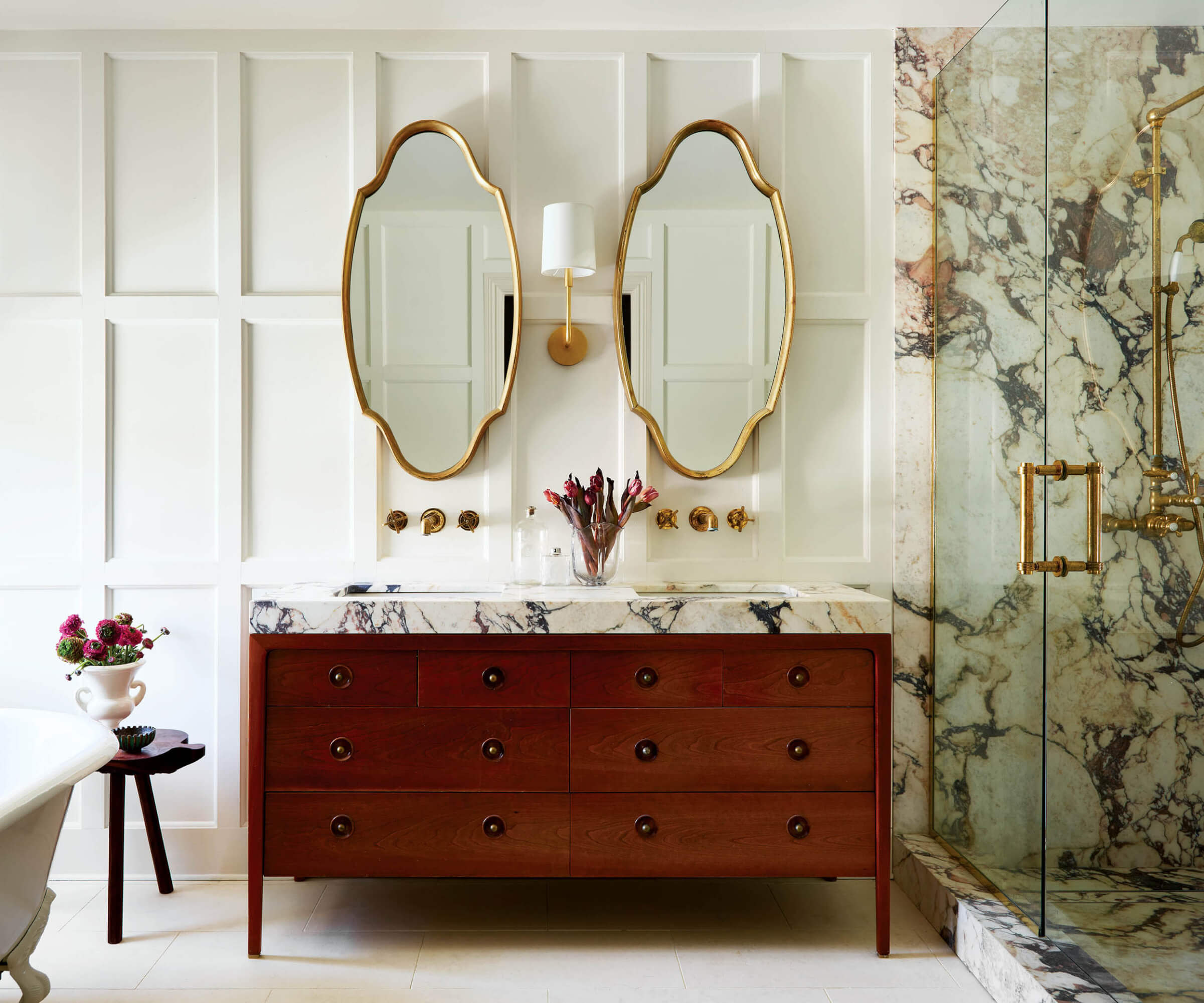 Head to Hudson Valley to see this refined bathroom designed by Isabel Brewster. Farrow & Ball’s Slipper Satin blankets the space. An antique dresser was retrofitted as a vanity and topped with Calacatta Viola Breccia from United Marble.