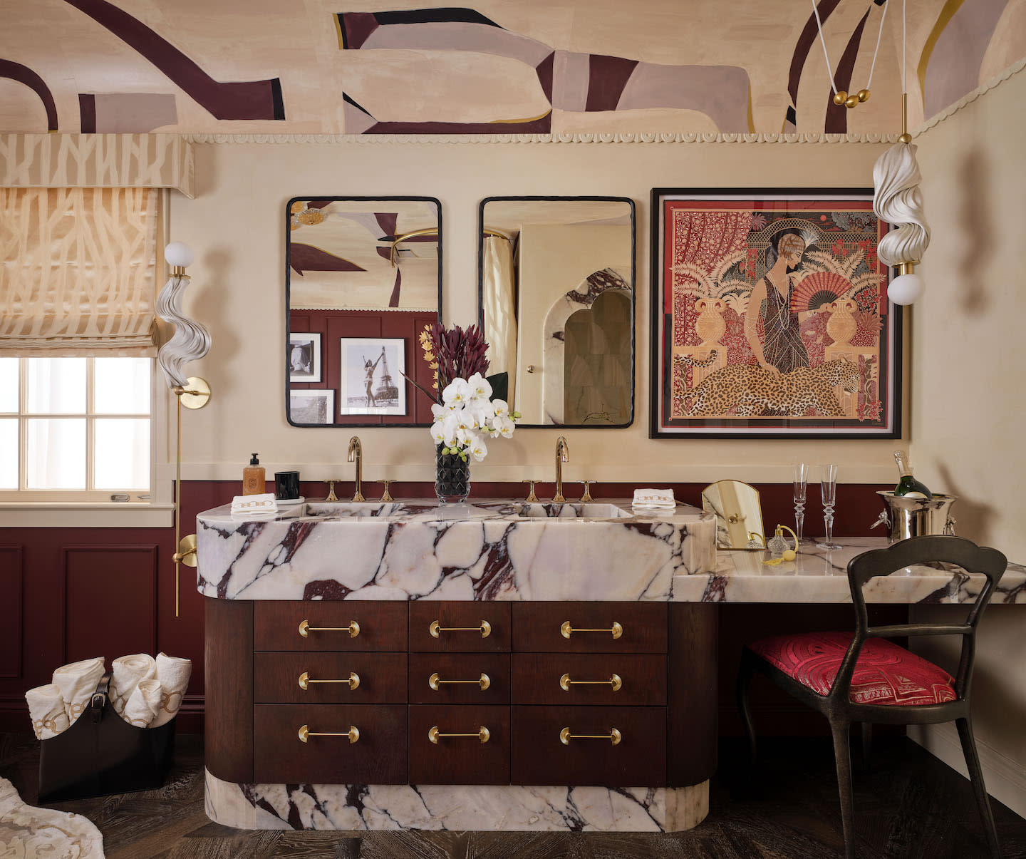 Calacatta Vagli Viola marble from Gramaco Stone Source steals the show in this Maryland bathroom by Elizabeth Reich, where Visual Comfort & Co. sconces flank Arteriors mirrors. Wood tiles from Tabarka Studio and plaster walls by Kelly Walker of Artstar Custom Paintworks add texture.