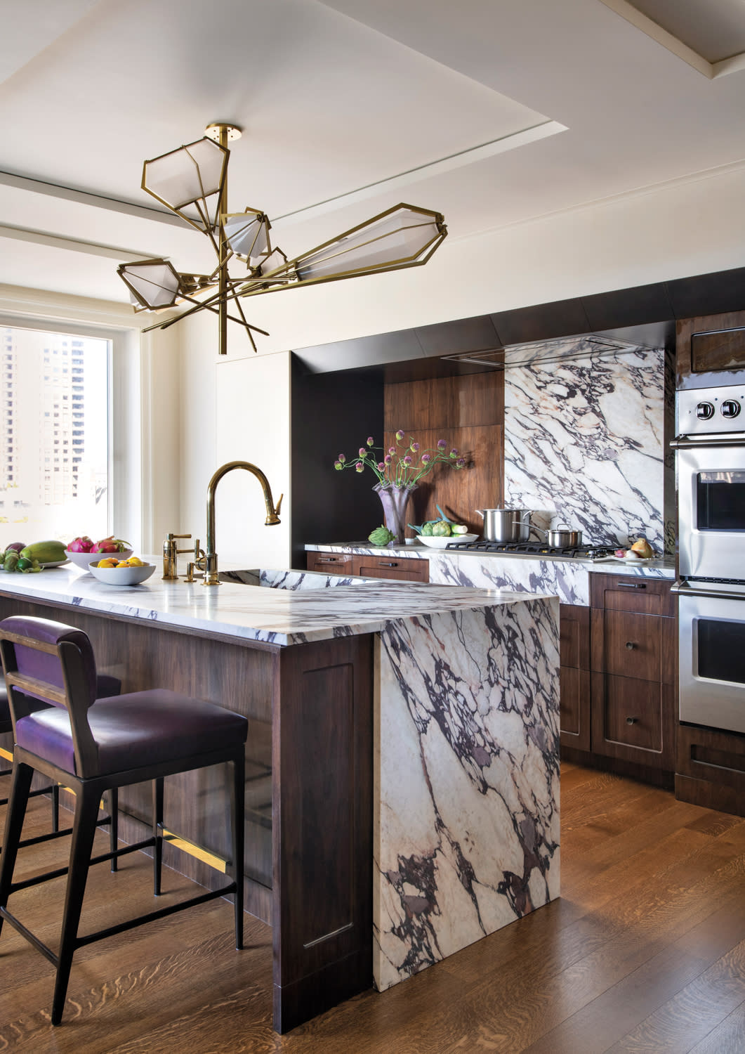 Mitchell Studio brought together Calacatta Viola marble and high-gloss walnut cabinetry with gunmetal steel details for a dramatic contrast in the kitchen of this Manhattan condo; a Gabriel Scott chandelier heightens the effect. The walls ovens and cooktop are Viking.