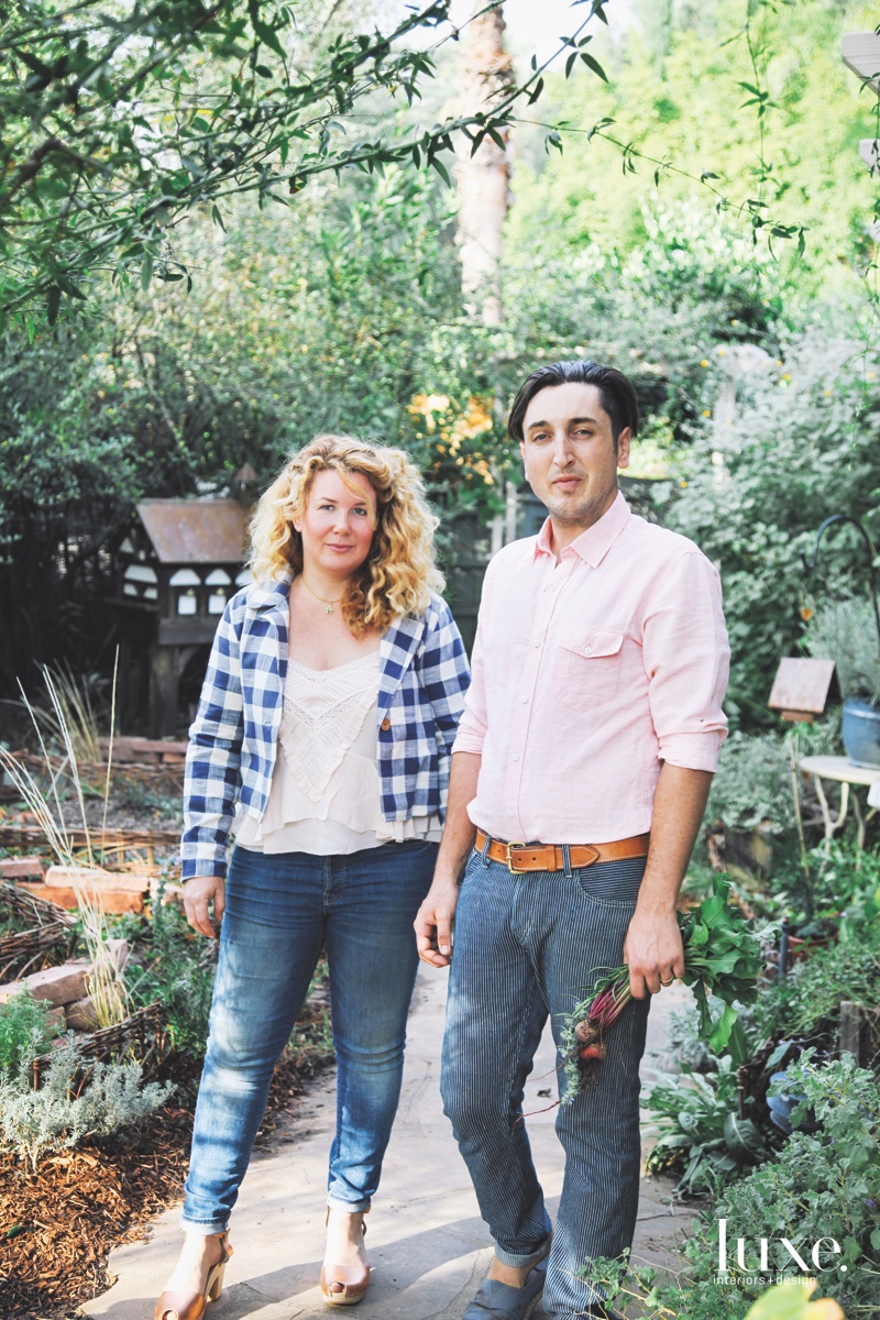 Justina and Trevor Freel stand in the garden of their La Canada home and studio, where they explore a variety of artistic disciplines through their creative practice, Rose Thicket.