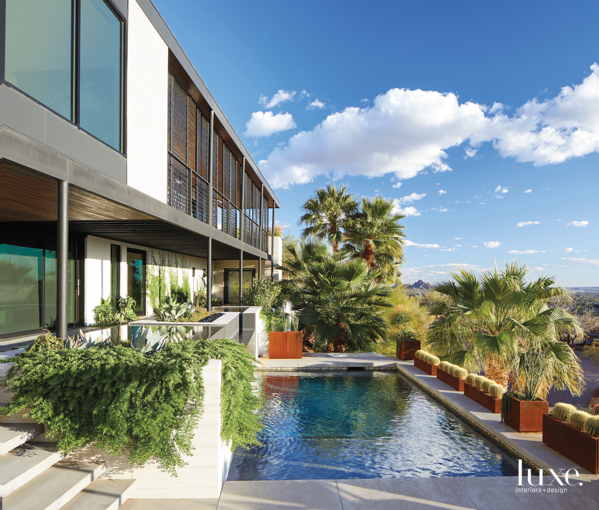 An upper-level water feature and spa spills into the swimming pool below, which echoes the form of the house. Landscape architect Charlie Ray framed the area with palm trees and sculptural plantings that tie to the desert topography and act as a screen for the outdoor area while allowing city views.