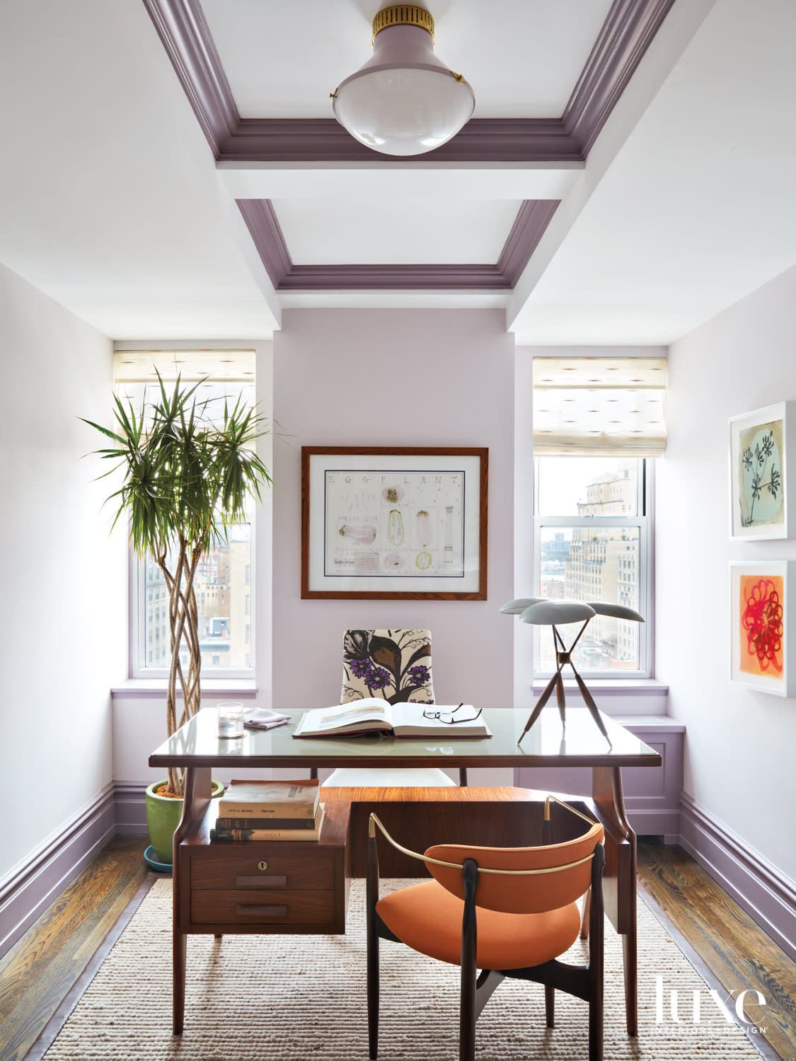 In a posh New York City duplex by Gideon Mendelson, this colorful home office is a study in purple with Benjamin Moore’s Hint of Violet on the walls and Mauve Blush on the trim. The Modernist lacquered desk from John Salibello Antiques is flanked by an armchair from Van Den Akker Antiques and an orange Dan Johnson for Selig side chair.