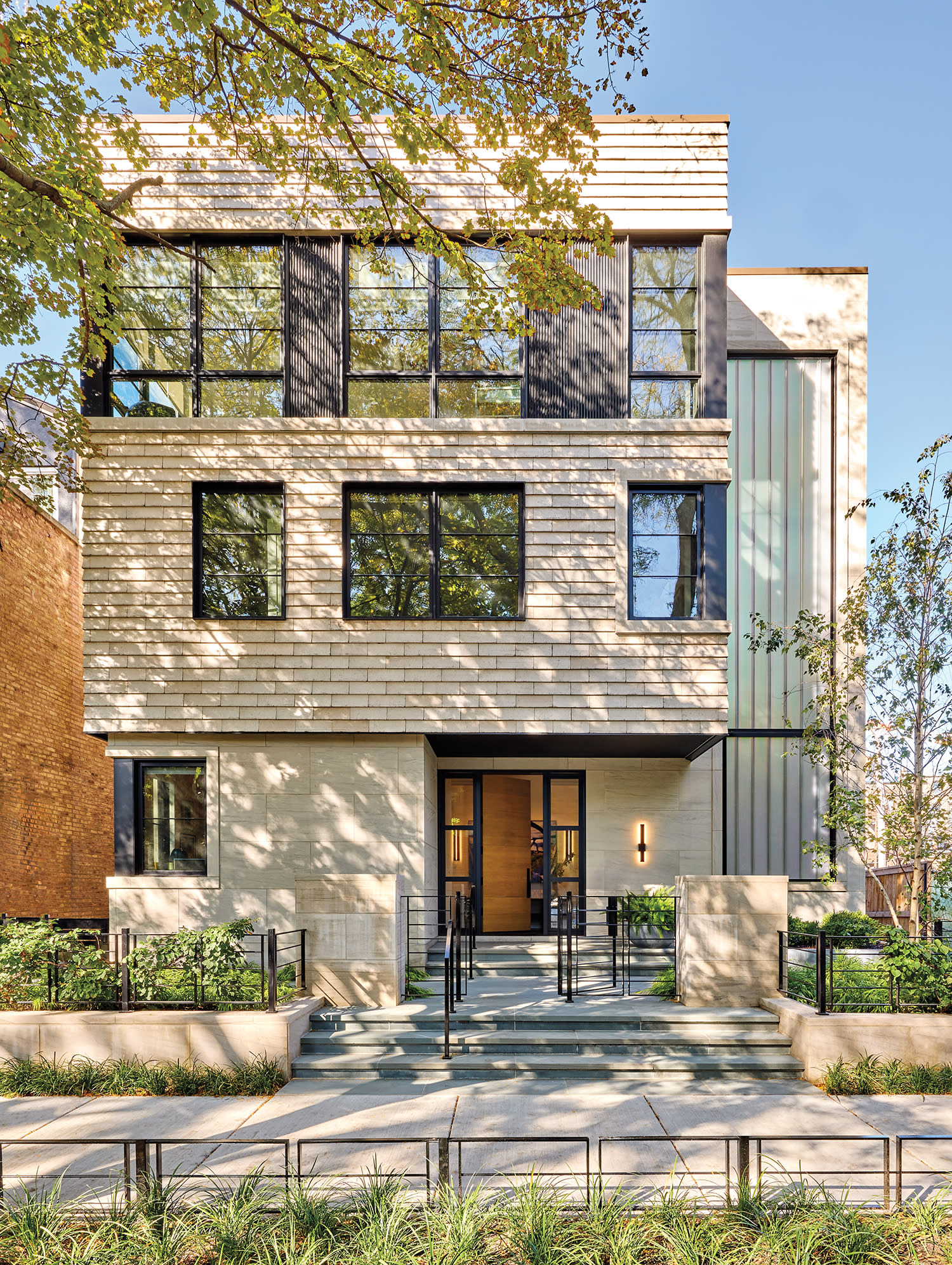 Dufresne’s approach created a variety of planes on the façade, which allowed a mix of textures in a “soft, clean palette,” he notes. As a nod to the city’s architectural history, he used limestone on the front of the first floor and an Italian terra-cotta tile that emulates a brick pattern on the second. Dark metal punctuates the front of the house and appears more prominently on its sides. The result, Dufresne says, is “timeless, not boastful.” Similarly, landscape designer Tiffany Evans, who also devised a rooftop vegetable garden for the husband, kept the plant palette “simple and tailored to have a variety of green hues and textures,” she explains.