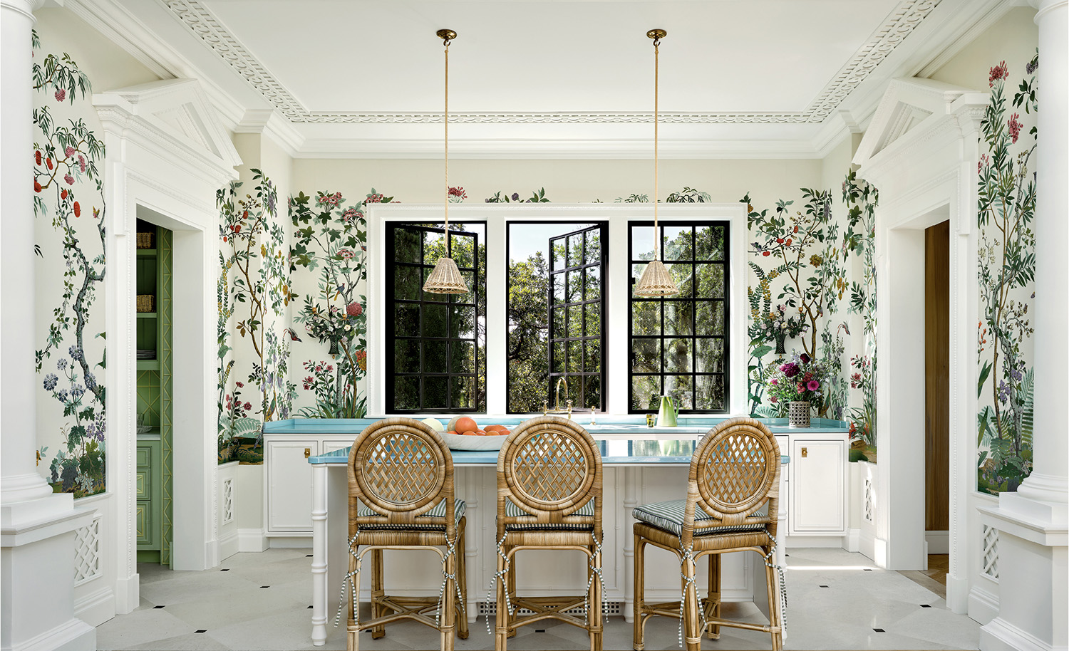 A Zuber mural envelops the kitchen, playing off sky-blue lava stone counters sourced through Sue Fisher King. The pendants are Soane Britain, and the counter stools are Mainly Baskets Home. EuroLine Windows flood the space with natural light.