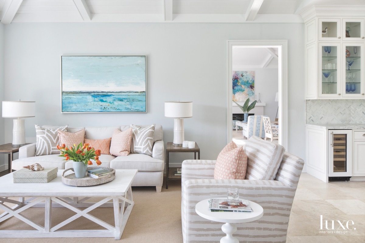 A similar philosophy defines the interiors, where Muller’s clean, classic look plays out in a renewed backdrop. While the walls were revived with a coat of soft gray paint, the interior designer decided to introduce a seaside palette of blues, neutrals and corals throughout the home using various patterns, textures and fabrics. In the living room, for example, cool-toned pillows on the white sofa, blue cushions on the twin rattan chairs, and the stripes on the upholstered slipper chairs tie the room’s accents together seamlessly. A colorful abstract by Carlos Ramirez hangs above the fireplace, which was refurbished with wavy white ceramic tile, reflecting this modern coastal vibe.