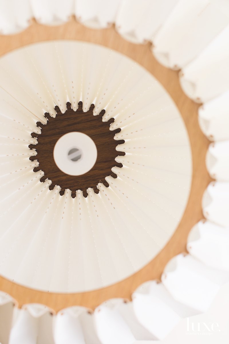 Designer Michael Towey painstakingly folds one of his fixtures for his collection of linen origami lighting in his Costa Mesa studio; hanging above are finished examples. The designer explains that the impulse behind the pieces stemmed from a desire to create efficient yet high-quality lighting.