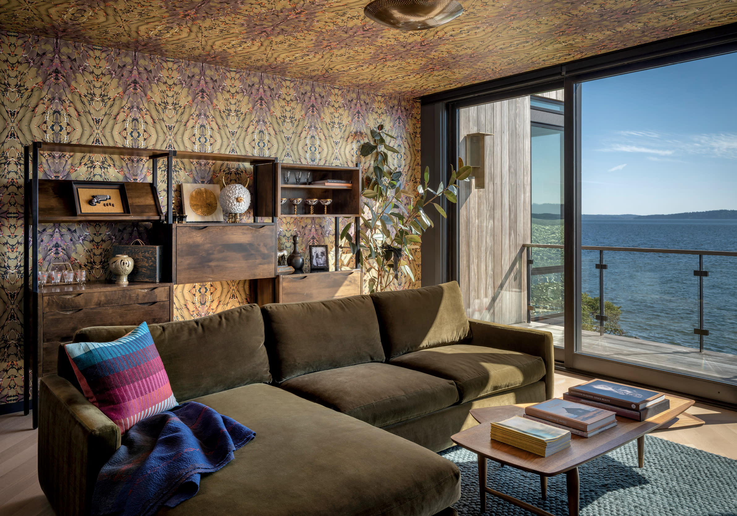 A Timorous Beasties wallcovering envelops the media room, where shelves display artwork by Jen Ament and family memorabilia. From the sofa, joined by a Warren C. Church coffee table, the owners enjoy the vistas through sliding doors by Kolbe Windows & Doors.