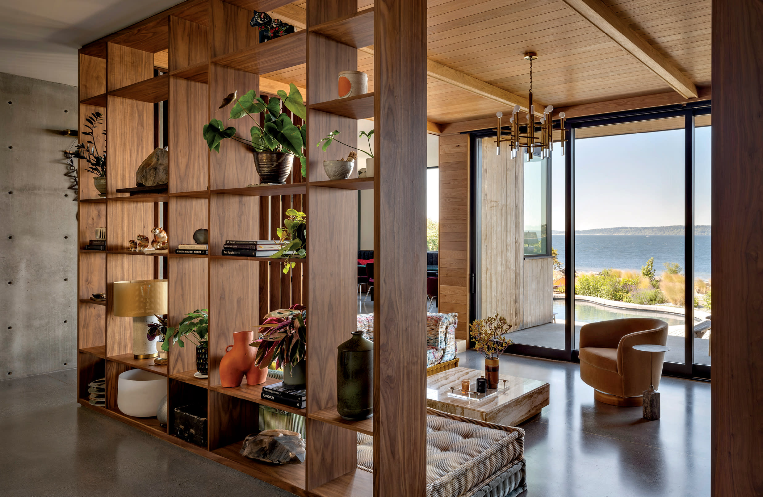 An open shelving system allows the living room’s water views to greet visitors in the entry. The living space is outfitted with a Milo Baughman chair, Roche Bobois sofa, coffee table from Tom Gorz Collection and vintage Gaetano Sciolari chandelier.