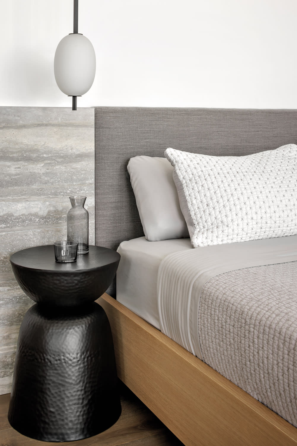 The exterior’s Zen-like effect continues seamlessly indoors. “Raw concrete and natural wood created a serene backdrop for what was to come with the interior design,” Starr says. “The circulation was closely developed with the design team. It emphasizes having a good time and relaxing.” Lounge-worthy upholstered seating with a contemporary bent was selected with this comfort in mind. At the husband’s request, Mangimelli avoided dark colors in favor of predominately soothing, beachy hues that complement the natural light streaming through a multitude of windows. This lightheartedness comes through in pieces like the dining area’s wavy table and rug, inspired by the couple’s lively personalities. “They have a vibrant energy—they’re fun people,” the designer says. “It’s a minimal home with modern principles, but we wanted to add this sense of playfulness.” The clients’ influence is especially evident in the primary suite, where they requested an open space with few walls for unimpeded ocean views. Embracing a studio-inspired layout, a luxurious soaking tub sits in front of a window—just steps from the bed.