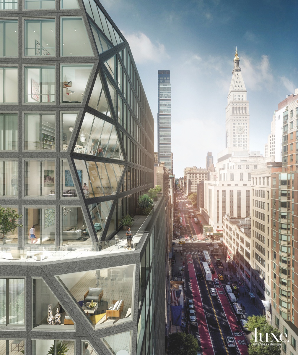 Coming this fall, New York’s Pelli Clarke Pelli Architects will introduce 138 East 50th, an 800-foot-tall residential tower with about 3,000 square feet per floor. “We amplified the massing’s low relief with folds of tall, rippling terra-cotta panels contrasting in direction and color,” says Craig Copeland, associate partner. “The inspiration came from studying and echoing the qualities of prominent Art Deco neighbors, like the Chrysler and Fuller buildings.”