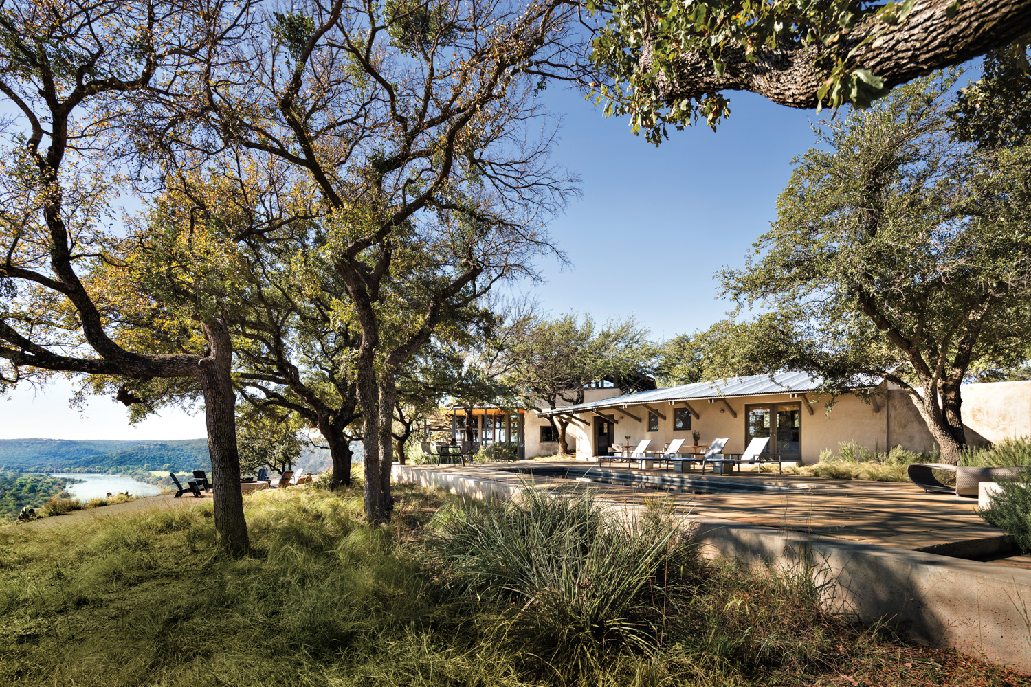Reed Hilderbrand designed sandstone terraces framed by lightly sandblasted concrete retaining walls and separated by groves of wind-sculpted oaks and cedar elms, which connect this Palo Pinto County compound’s three dwellings while creating a variety of outdoor gathering spaces. Janus et Cie’s Duo chaise lounges provide seating alongside a rectangular pool oriented toward the river.