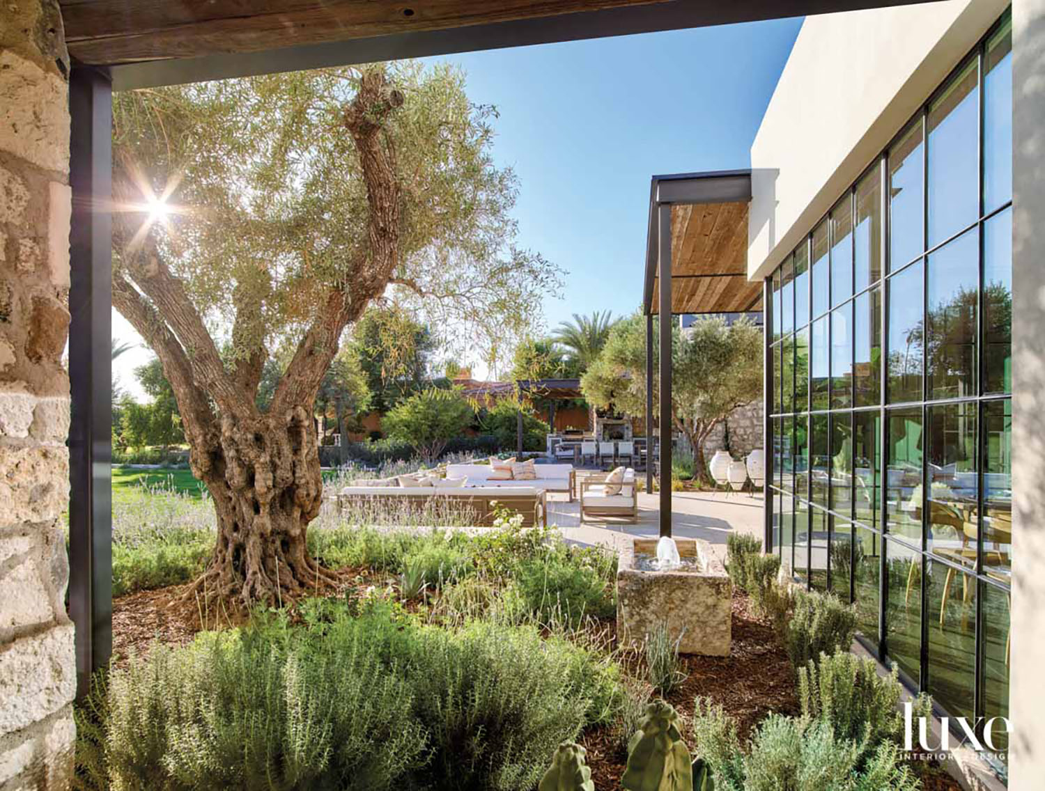 Purchased by the designer and shipped to the site, mature trees from Ancient Olive Trees add instant character to the outdoor living room, where a teak sofa and chairs in outdoor white linen from RH surround a coffee table by AllModern. The trough fountain is from Studio Ressource.