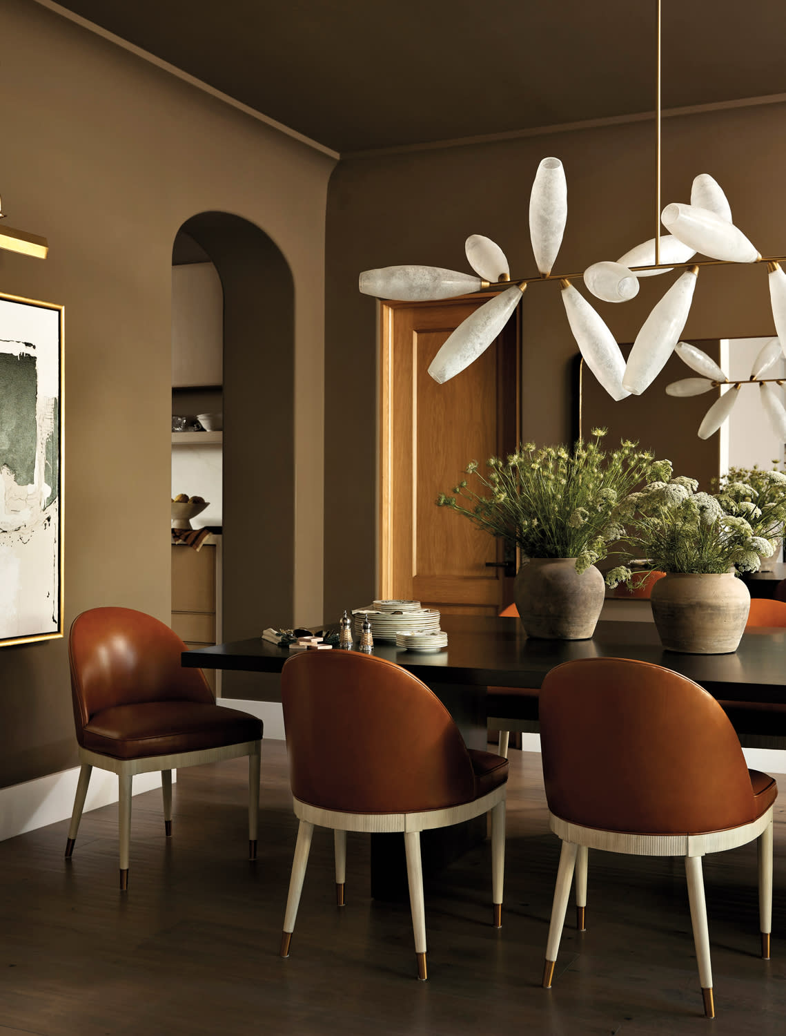 Then there’s all the storytelling elements—those pieces that speak to the character of the owners. The foyer displays some of her parents’ beloved books and photographs while the piano room just off the entry features artwork, artifacts and even more of their library within distinctive coves. The dining room, also located just beyond the foyer, is drenched in cocoa-colored paint (“which just envelops you,” Green muses) setting off a distinctive Murano-glass chandelier the designer chose as an element of surprise. “I knew my parents’ style and what they would love, but I also knew when to challenge them,” she notes.
