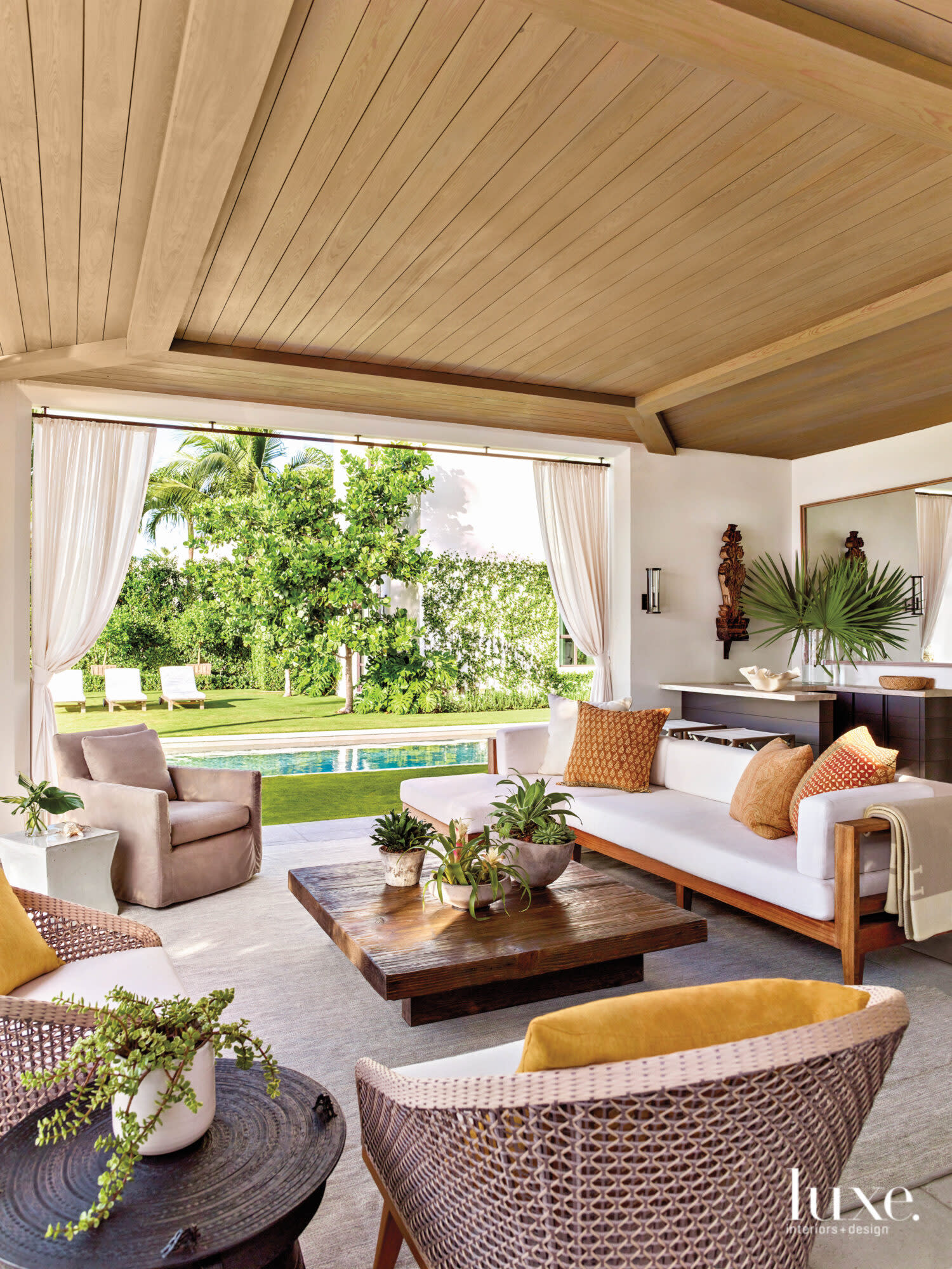 In the airy loggia, “a Cypress-planked ceiling offers a textural surface to anchor the space,” says Booth. Wicker armchairs from Palecek and a slipcovered Lee Industries chair huddle around a low coffee table from Dos Gallos and a Homenature custom sectional.