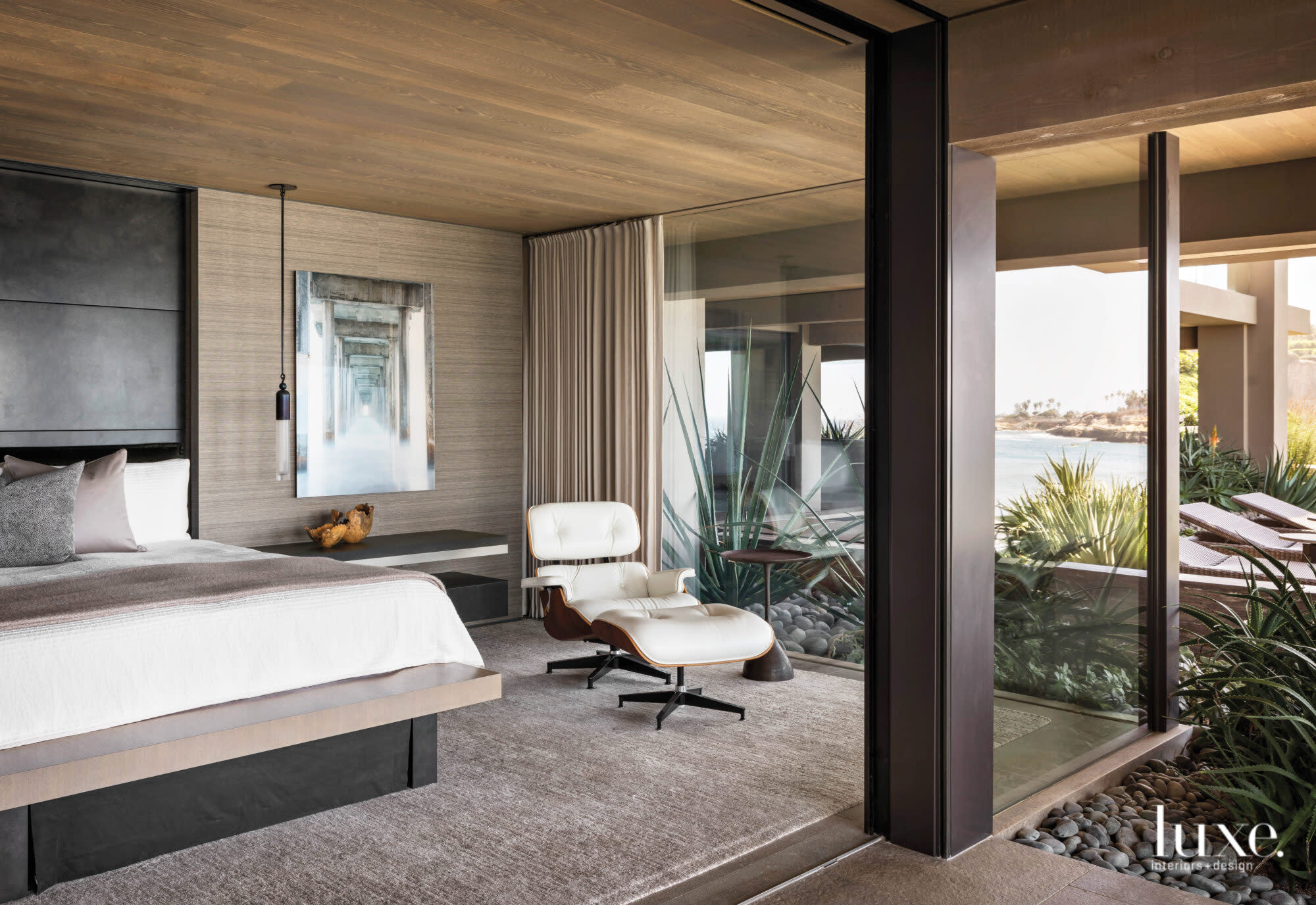 Thoroughly revamped, the guest room boasts a warm, neutral palette, typified by the Innovations wallcovering. An Apparatus fixture hangs above a floating bedside table, part of the custom headboard, which incorporates patinated metal panels. Draperies in a Rogers & Goffigon solid offer privacy when closed.