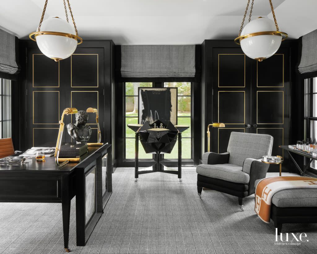 Holland & Sherry’s cashmere houndstooth plaid feels appropriate for the armchairs in her husband’s first-floor study. The Ico Parisi polyhedron bar was her gift to him. Circa Lighting pendants add to the classic clubroom air. The desk is a beloved vintage Maison Jansen piece.