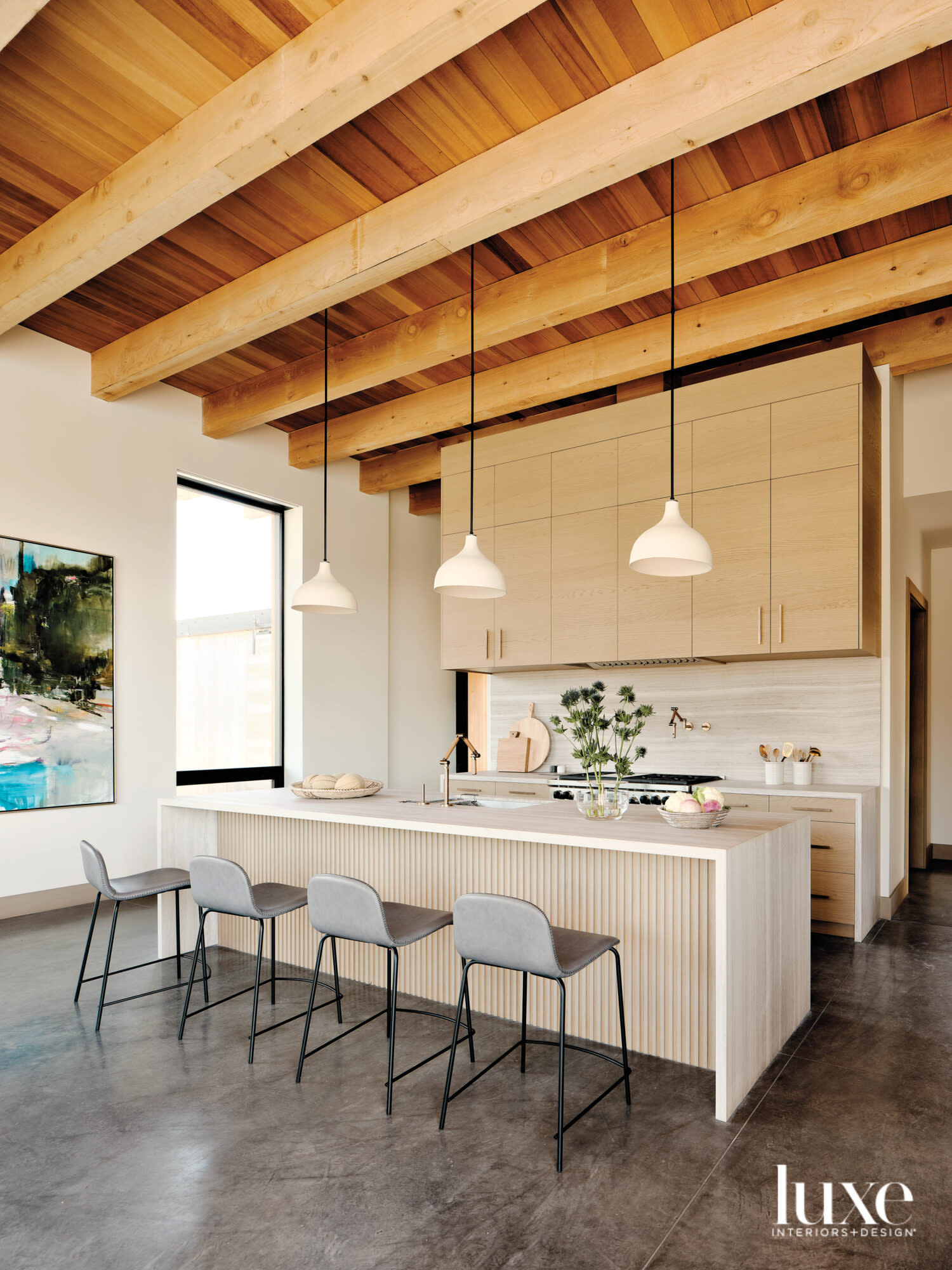 Towering ceilings in the kitchen required creative custom cabinetry, so Cardanini turned to Zachary Lindsey to create cabinets with tall doors. For the island, a rippled surface in a light-oak finish adds interest. Counter seating is a series of Slope bar stools by West Elm, and the trio of Folk pendants are by Rejuvenation. The painting is by Edwige Fouvry.