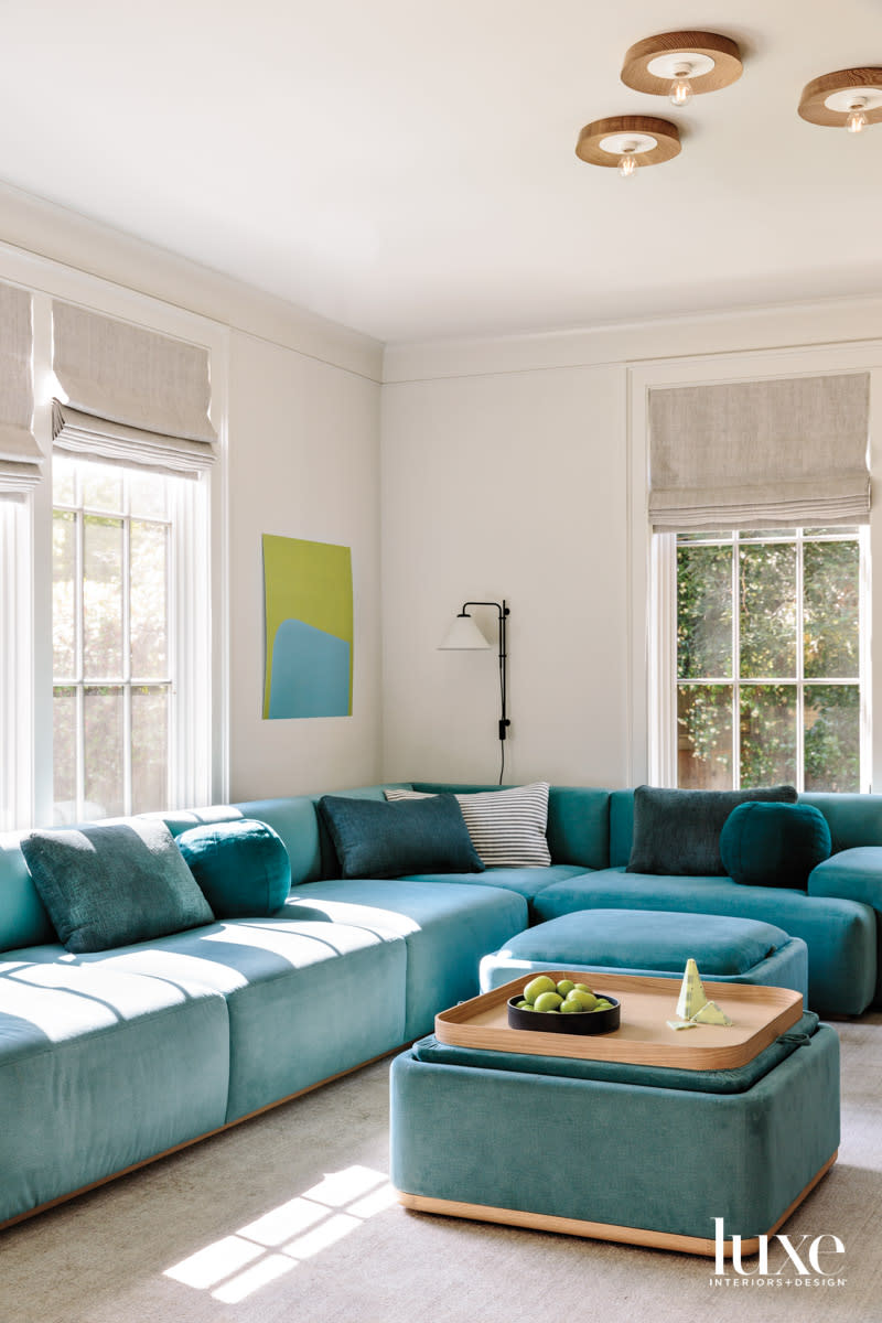 The family room features a custom sectional and ottomans. Stone found the Lluis Porqueras sconce at Marset. The rug is from Stark.