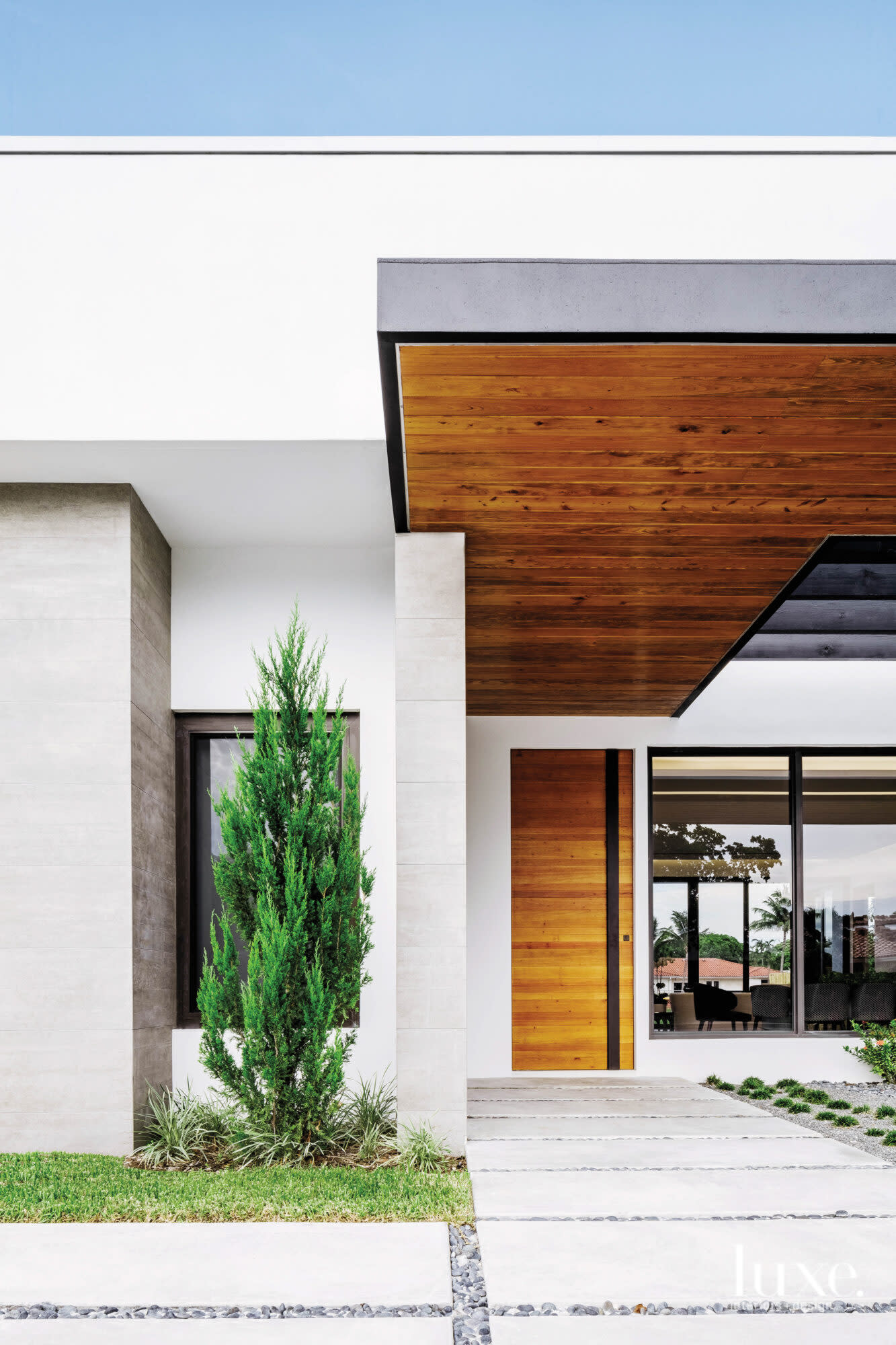 Designer Tamara Feldman infused the modern exterior of a Miami home with organic, Mexican-inspired elements such as a solid walnut door with a metal detail and handle from Doors Galour and concrete tiles with a cedar wood ceiling by Valencia Coverings. “The combination of wood, concrete and stone tell a story about symmetry and balance, which is incorporated throughout the home,” she says.