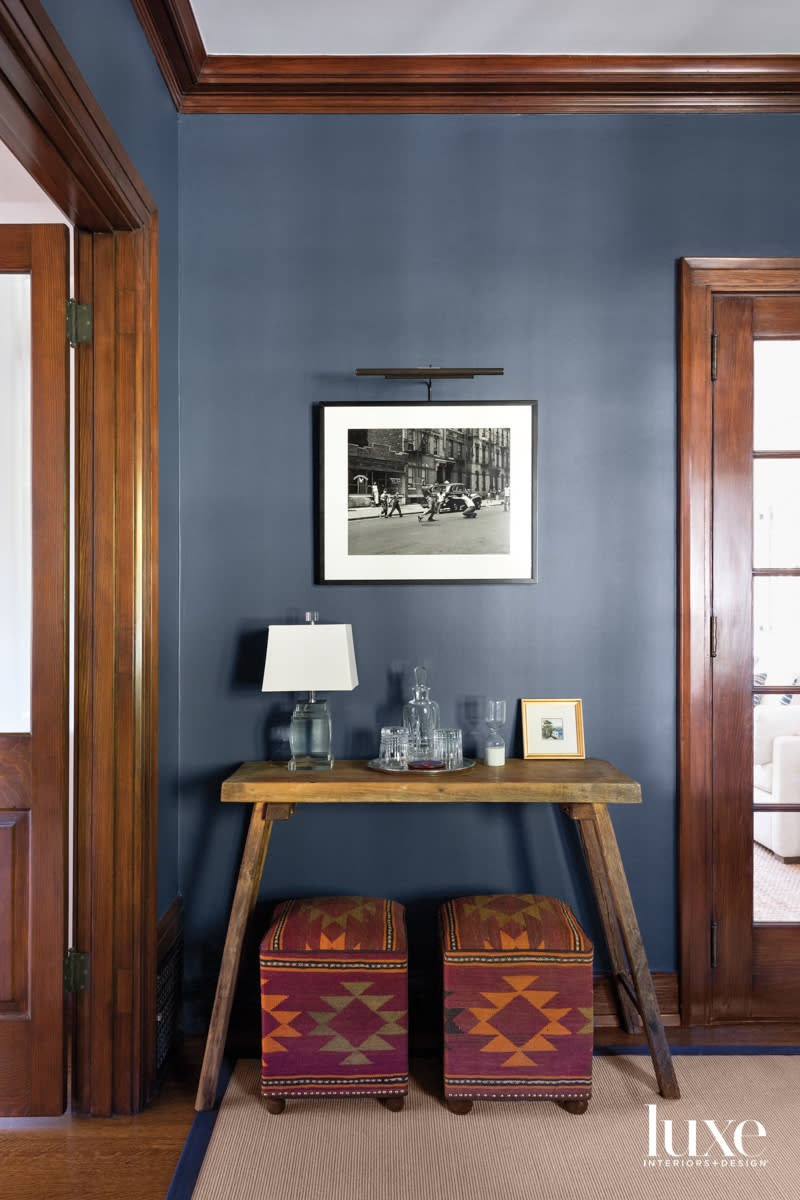 In the office, Lost Highway by Portola Paints & Glazes is the backdrop for a vintage console and patterned ottomans, all from Dekor. A picture light by Situ Lighting illuminates an Arthur Leipzig photograph.