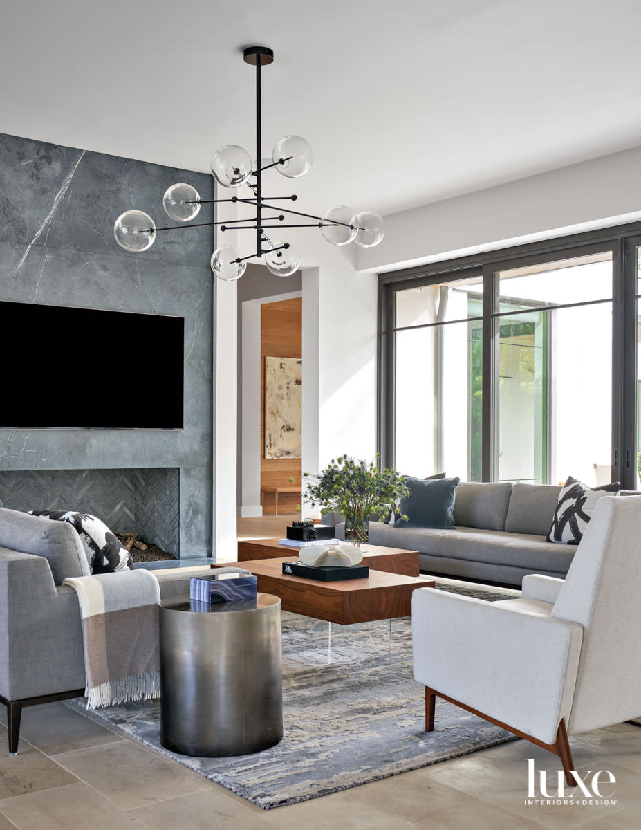 Subtle textures and patterns enliven the family room’s cool palette of grays and whites, including honed soapstone slabs on the fireplace wall. A rug from Interior Resources and the Canaletto walnut top on Cattelan Italia’s Lingotto coffee table continue the textural effect.