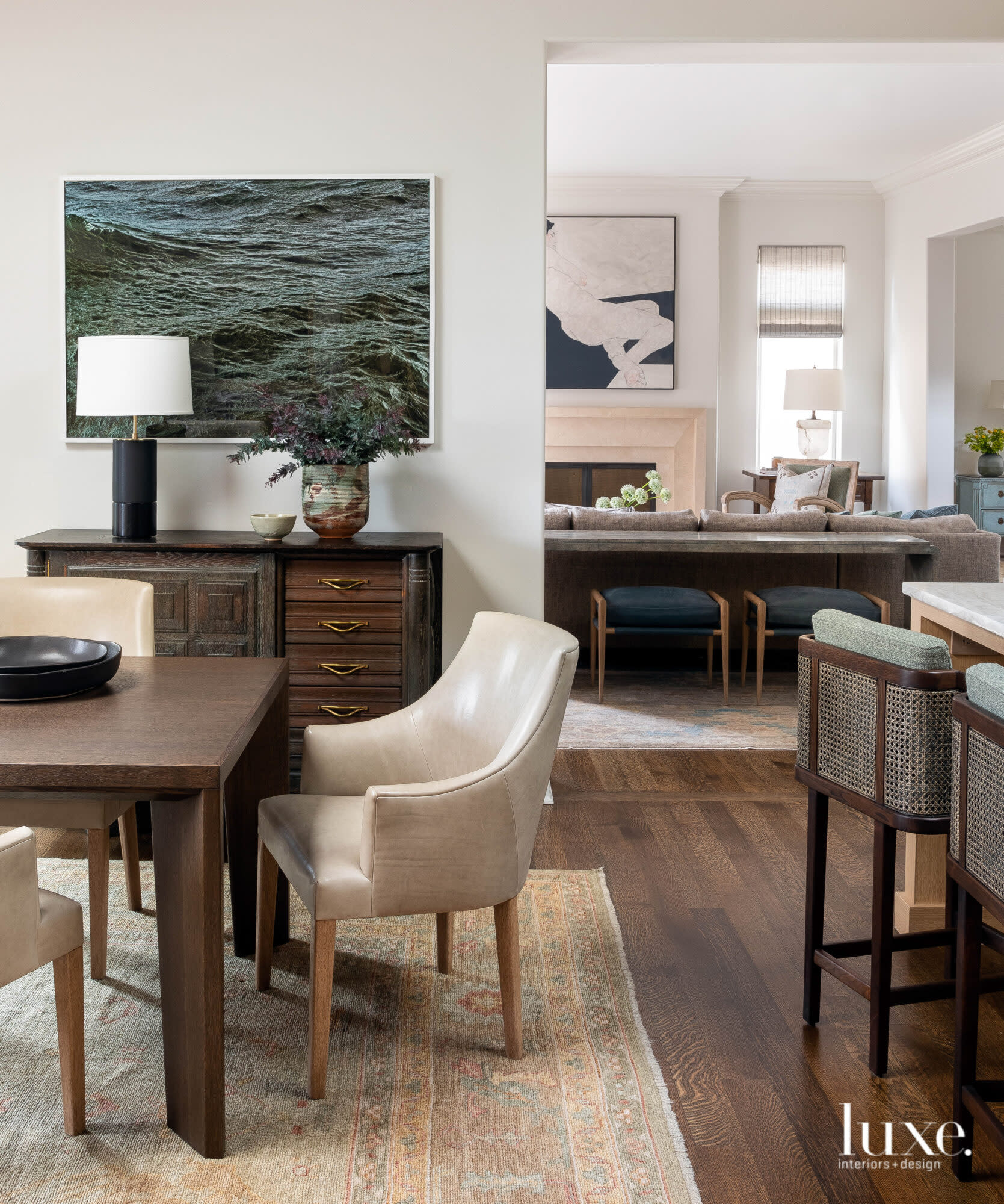 The dining area also serves as an office for the homeowner. He can spread out at the Holly Hunt table and be comfortably productive seated in one of the Rose Tarlow chairs. Beneath the Jessica Cantlin painting is a vintage Charles Dudouyt credenza found on 1stdibs and a Stone and Sawyer lamp from Housewright Gallery. Underfoot is a Mansour rug.