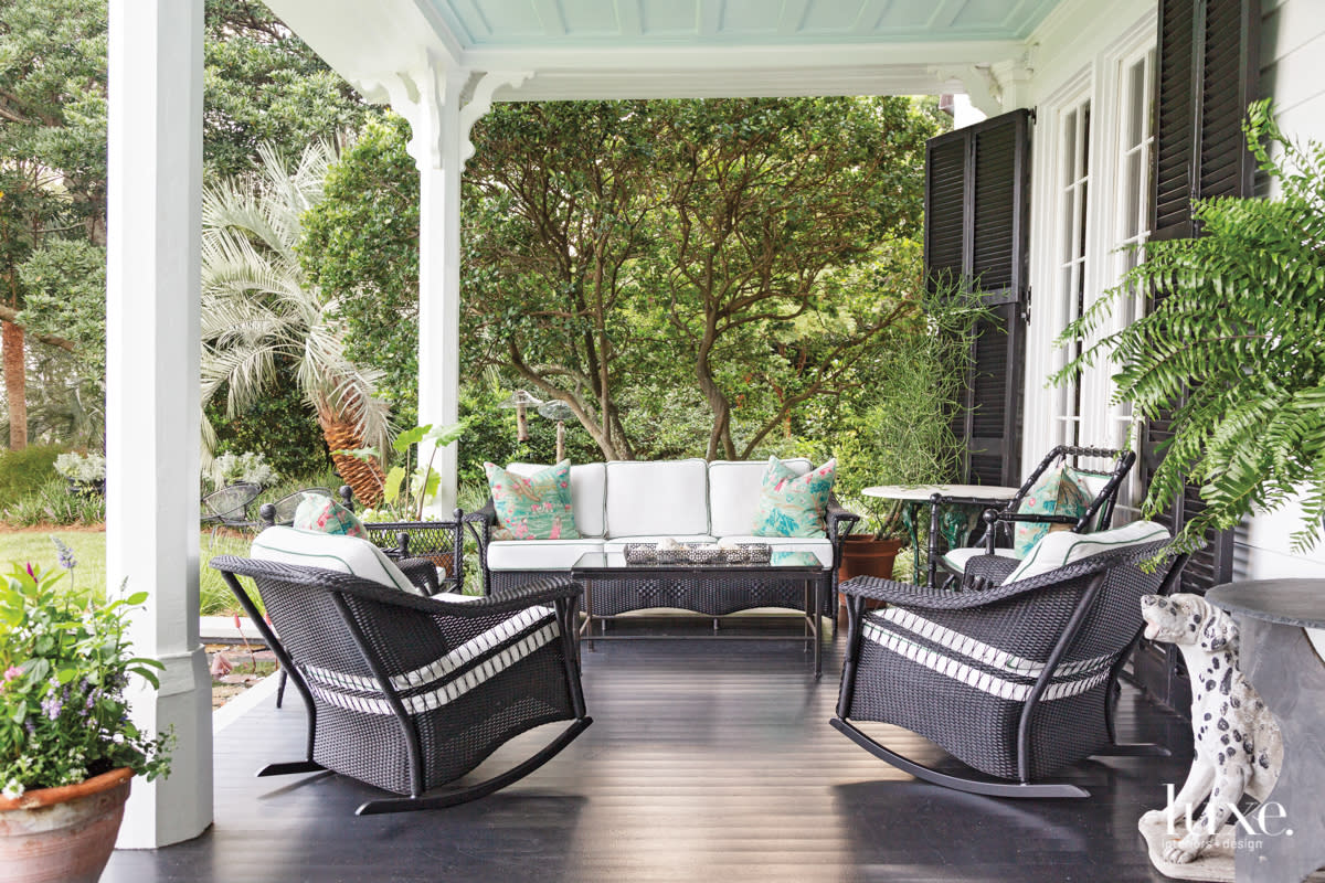 In Charleston, porches are really important,” says Stuart, who restored the home’s original porch with general contractor Bob Fleming. The black wicker furniture is from Lloyd Flanders in Menominee, Michigan. The cushions are upholstered in a Perennials canvas weave and the accent pillows are fashioned from Schumacher’s Yangtze River linen in jade. Serving as a charming conversation piece, the Dalmatian was sourced in France.