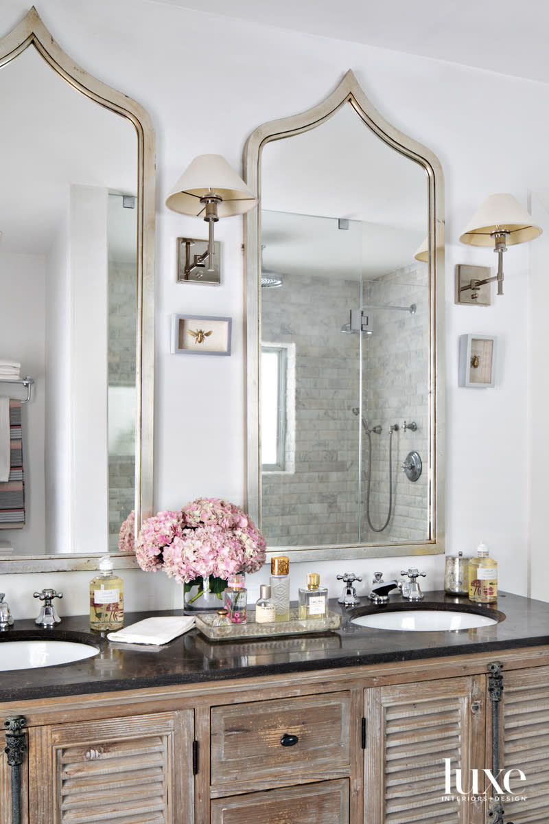 A pair of Moroccan-inspired, silver-leaf Worlds Away iron mirrors hangs above the main bathroom’s GJ Styles reclaimed-pine double vanity. A Belgian Bluestone countertop with undermount oval sinks and RH sconces with linen shades complete the look.