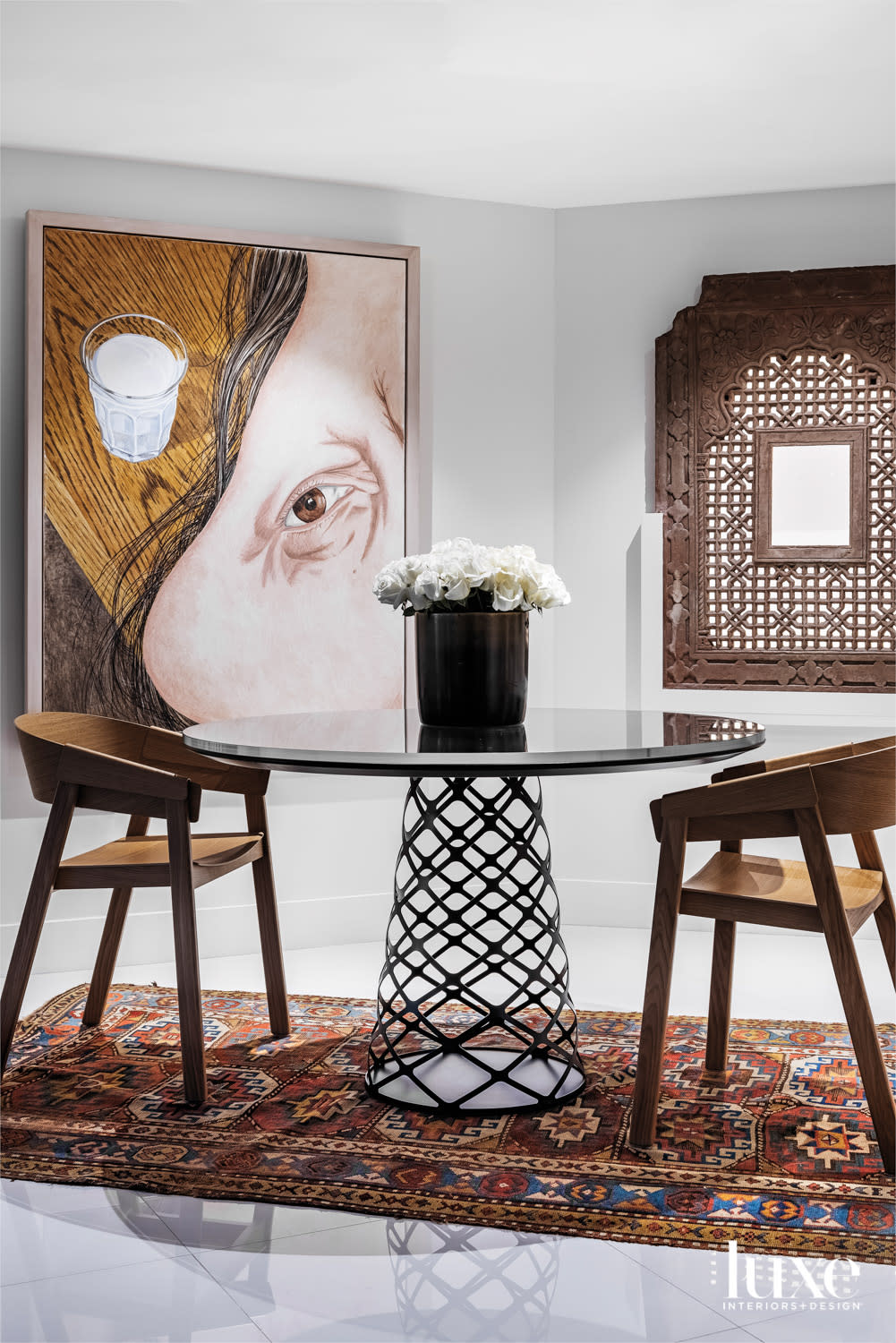 A surreal painting by Alan Turner pairs with a jali screen in the library. Muuto’s Cover armchairs from Design Public pull up to Gubi’s Aoyama table on an existing rug.