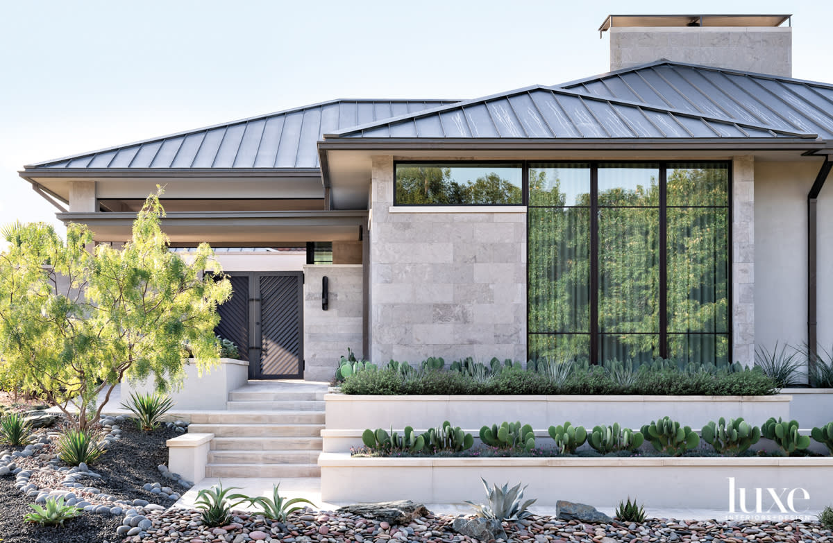 Limestone steps and integrated planting beds lead to the home’s elevated main entry. The structure’s streamlined, contemporary form is accentuated by clean-cut limestone walls, a standing-seam metal roof and a simple palette of low-maintenance plants.