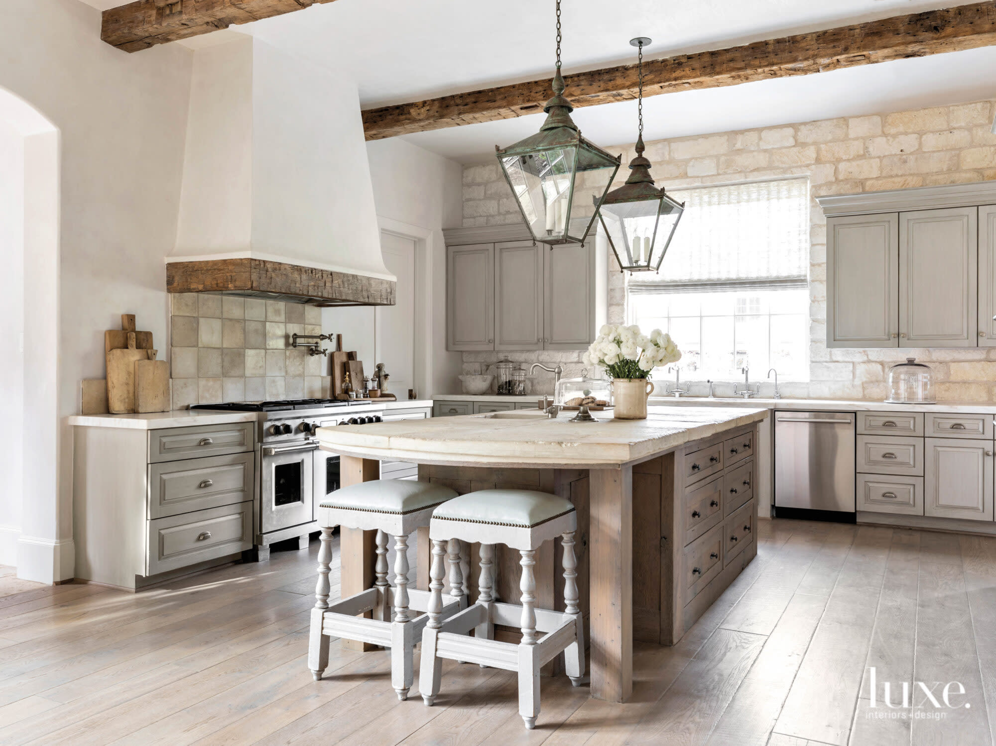 In the kitchen, Segreto Finishes added patina to cabinetry and plastered the vent hood, which features a vintage wood beam. Antique lanterns, reclaimed-stone counters and antique concrete tile for the backsplash, all sourced from Chateau Domingue, impart a sense of age.