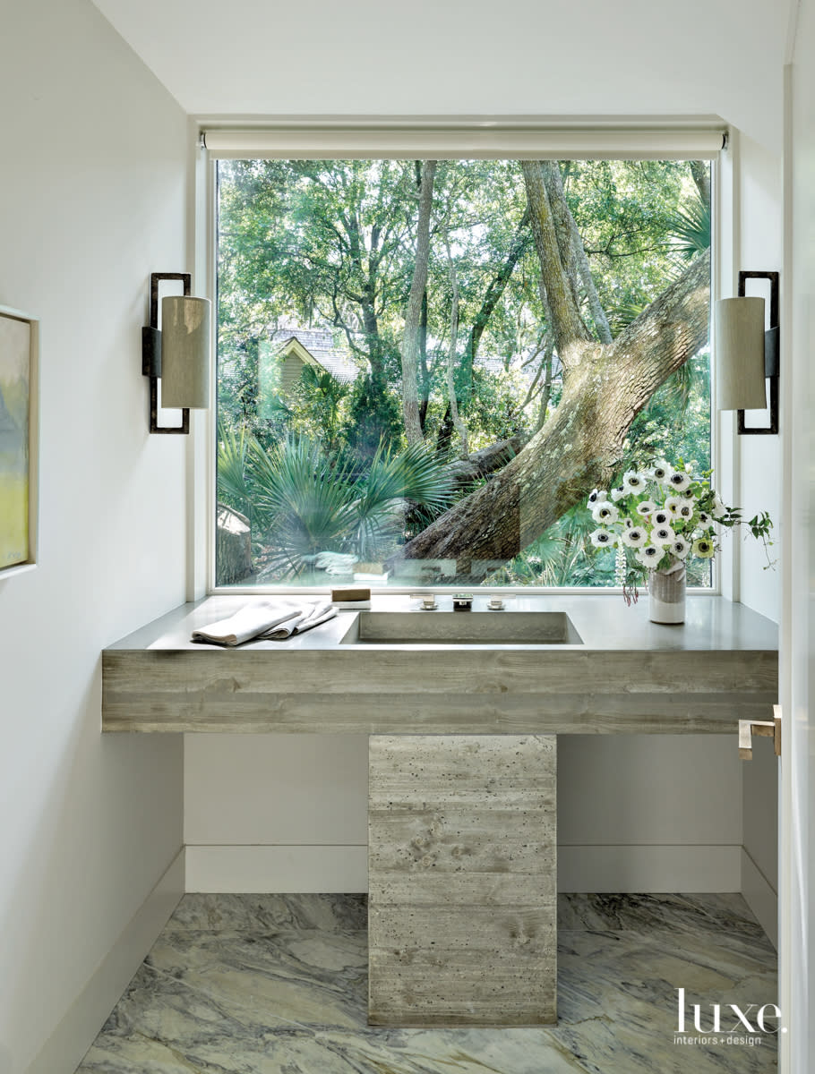 With a picture window to bring the outdoors in, this powder room is furnished by the same philosophy: Namely, the concrete vanity repeats the home’s exterior finish indoors. A pair of burnt silver Lille wall lights by Porta Romana flank the view. The floors feature book-matched Calacatta Manhattan marble from Marmi Natural Stone in Atlanta.