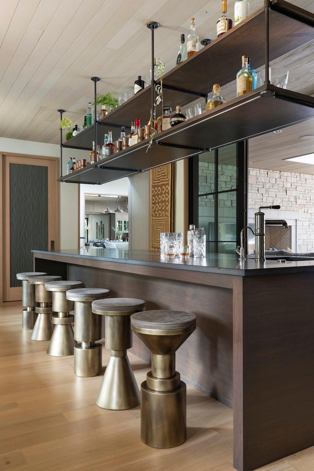 An industrial-inspired indoor bar featuring a concrete counter, hanging wood shelving, and bold brass stools that serve as both seating and statement pieces.